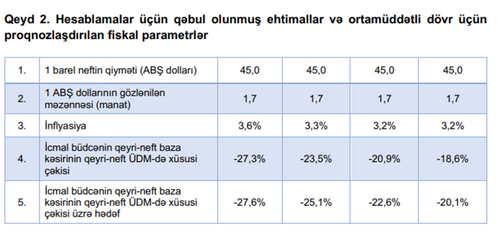 “Ortamüddətli dövr üçün resurs zərfi hesablanarkən neftin bir barelinin orta illik qiyməti 45 ABŞ dollarına bərabər götürülmüşdür. Lakin, dövlət büdcəsinin layihəsinin tərtibi zamanı başqa qiymət əsas götürülə bilər. Neftin qiyməti ilə yanaşı, ortamüddətli dövr üçün manatın məzənnəsinin ABŞ dollarına nisbətdə sabit qalması (1,7 manat), neft yataqlarının işlənməsi və hasilatın pay bölgüsünə dair sazişlərin müddəti, hasilat həcmləri ilə bağlı beynəlxalq razılaşmalar, habelə ÜDM-in artım tempi ilə bağlı Azərbaycan Respublikası İqtisadiyyat Nazirliyinin proqnoz və hədəfləri, eləcə də vergi-gömrük siyasətinin təkmilləşdirilməsi ilə bağlı tədbirlər gəlirlərin proqnozlaşdırılması zamanı ehtimal və fərziyyələrin əsasını təşkil etmişdir”,- Açıqlamada deyilir.