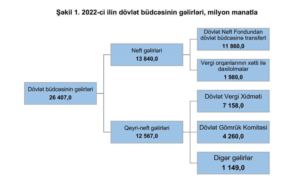 Açıqlamada qeyd edilib ki, 2022-ci ildə dövlət büdcəsinin gəlirləri 26 milyard 407 milyon manat məbləğində proqnozlaşdırılır ki, bu da ÜDM-in 32,5 faizini təşkil edəcəkdir. Gəlirlərin proqnozlaşdırılan həcmi 2021-ci ilin təsdiq edilmiş göstəricisinə nəzərən 3,8 faiz çoxdur.