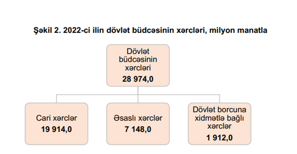 2022-ci ildə dövlət büdcəsinin xərcləri 2021-ci ilin təsdiq edilmiş göstəricisinə nəzərən 1,5 faiz artıq olmaqla 28 milyard 974 milyon manat məbləğində (ÜDM-in 35,6 faizi) proqnozlaşdırılmışdır. Xərclərin 68,7 faizini cari xərclər, 24,7 faizini əsaslı xərclər, 6,6 faizini isə dövlət borcuna və öhdəliklərinə xidmətlə bağlı xərclər təşkil edir. Qeyd olunan dövrdə əsasən əməyin ödənişi və sosial ödənişlərin artması hesabına cari xərclərin əvvəlki ilin proqnoz göstəricisi ilə müqayisədə 10,5 faizlik artımı, əsaslı xərclərin 14,1 faiz, dövlət borcuna xidmətlə bağlı xərclərin isə 13,0 faiz azalması proqnozlaşdırılır.