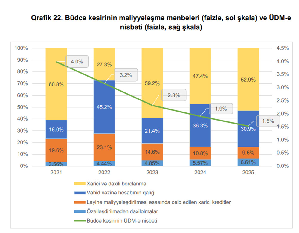 2022-ci ildə dövlət büdcəsinin kəsirinin 2021-ci ilin təsdiq edilmiş göstəricisindən 17,6 faiz az olmaqla 2 milyard 567 milyon manat olacağı proqnozlaşdırılır ki, bu da ÜDM-in 3,2 faizini təşkil edəcəkdir. Kəsir vahid xəzinə hesabının qalığı (45,2 faiz), daxili və xarici borclanma (27,3 faiz), layihə maliyyələşdirilməsi əsasında cəlb edilən kreditlər (23,1 faiz) və özəlləşmədən daxilolmalar (4,4 faiz) hesabına maliyyələşdiriləcəkdir.