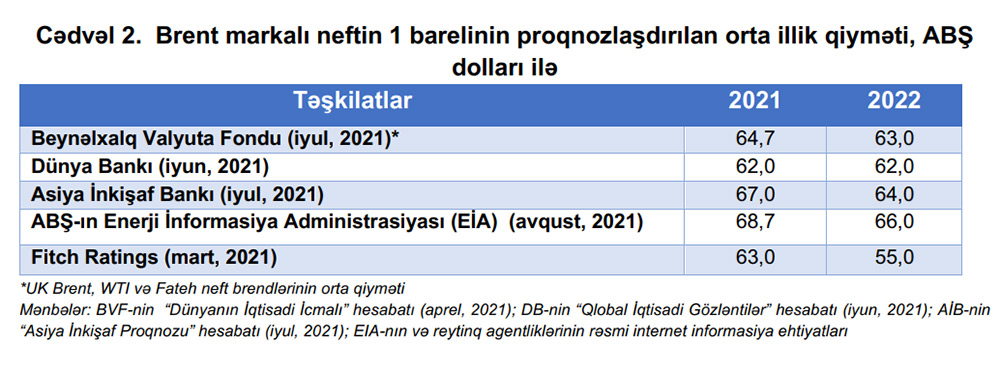 Dünyanın aparıcı maliyyə təşkilatları və neft qiymətlərinin proqnozlaşdırılması üzrə ixtisaslaşmış agentliklər 2020-ci ildə 1 barelinin orta qiyməti 41,3 ABŞ dolları olmuş, Brent markalı neftin qiymətinin 2021-ci il üçün 65 ABŞ dolları civarında olacağını və ən azı növbəti bir ildə də neftin qiymətlərində kəskin dəyişikliyin baş verməyəcəyini proqnozlaşdırırlar.