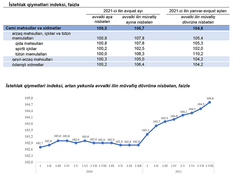Xatırladaq ki, 2021-ci ilin yanvar-iyul aylarında istehlak qiymətləri indeksi 2020-ci ilin yanvar-iyul aylarına nisbətən 4,5 faiz, o cümlədən ərzaq məhsulları, içkilər və tütün məmulatları üzrə 5,1 faiz, qeyri-ərzaq məhsulları üzrə 4,1 faiz, əhaliyə göstərilmiş ödənişli xidmətlər üzrə 3,9 faiz artmışdı. Cari ilin iyul ayında istehlak qiymətləri indeksi əvvəlki aya nisbətən 0,9 faiz, əvvəlki ilin iyul ayına nisbətən 6,0 faiz tyüksəlmişdi.