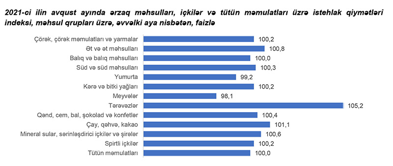 2021-ci ilin avqust ayındaərzaq məhsulları, içkilər və tütün məmulatları üzrə istehlak qiymətləri indeksi əvvəlki aya nisbətən 0,8 faiz, əvvəlki ilin avqust ayına nisbətən 7,8 faiz yüksəlib.