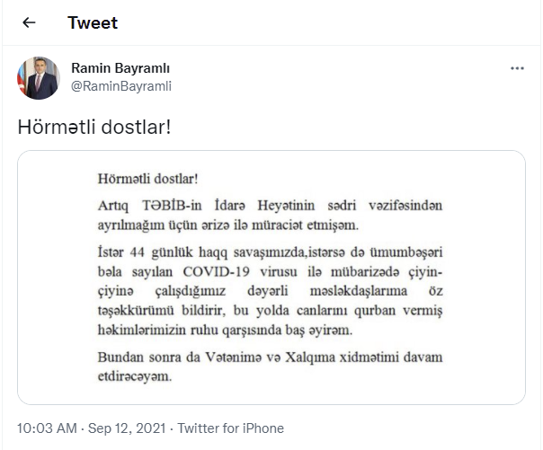 "Artıq TƏBİB-in İdarə Heyətinin sədri vəzifəsindən ayrılmağım üçün ərizə ilə müraciət etmişəm.