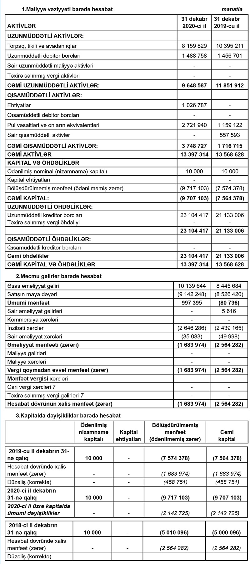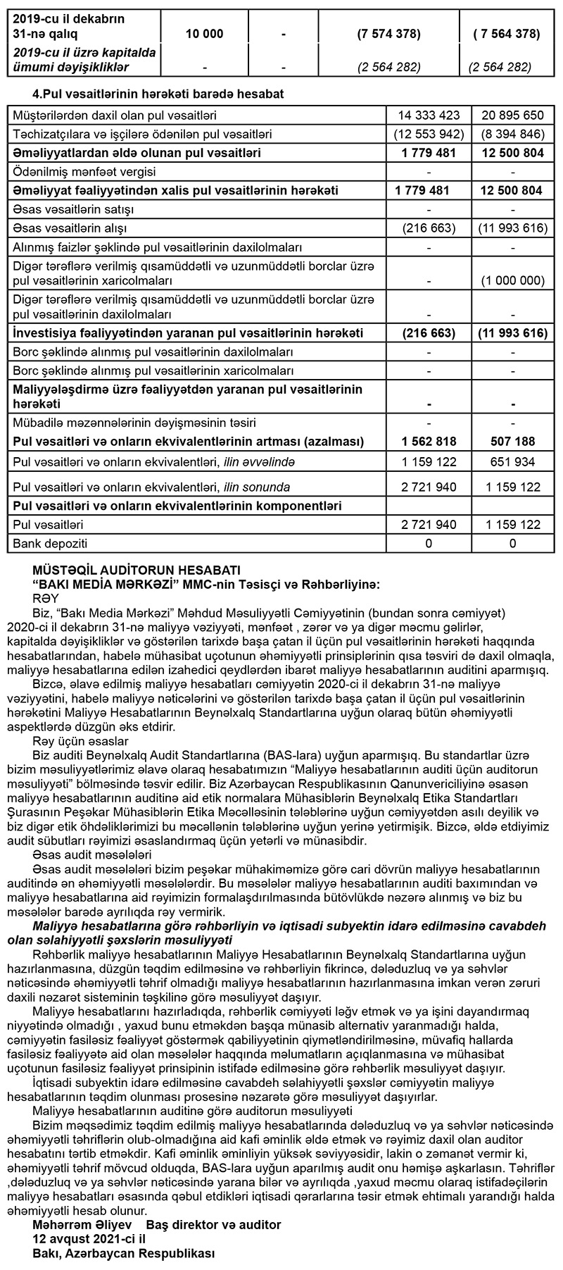 Azərbaycanda audiovizual məhsulların istehsalı ilə məşğul olan “Bakı Media Mərkəzi” Məhdud Məsuliyyətli Cəmiyyəti 2020-ci il dekabrın 31-nə maliyyə fəaliyyətinin nəticələri haqqında hesabatını dərc etdirib.