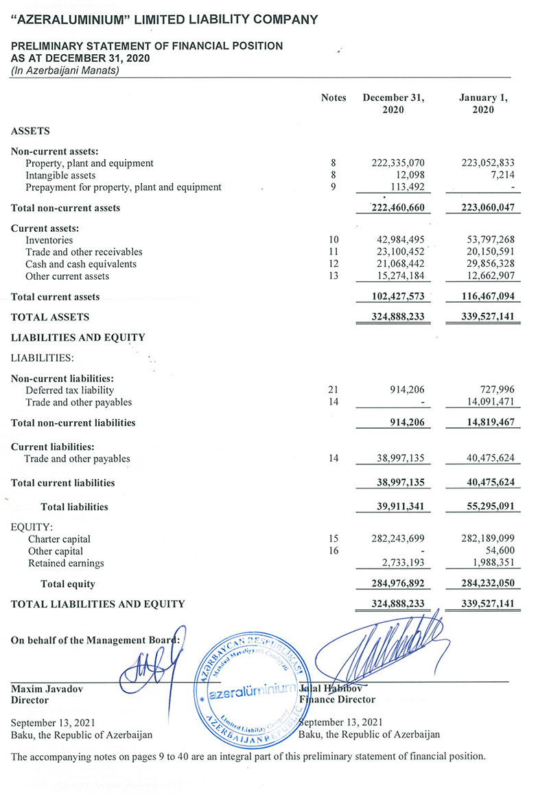 Ötən il Şirkətin satışdan gəlirləri 172 milyon 821 min 145 manat, satışın maya dəyəri isə 160 milyon 298 min 646 manat olub. Müqayisə üçün qeyd edək ki, 2019-cu ildə “Azəralüminium”un əsas əməliyyat gəlirləri 203 milyon 197 min manat (2018-ci illə müqayisədə 10,7 dəfə çox), satışının maya dəyəri 179 milyon 812 min manat (11 dəfə çox) təşkil etmişdi.