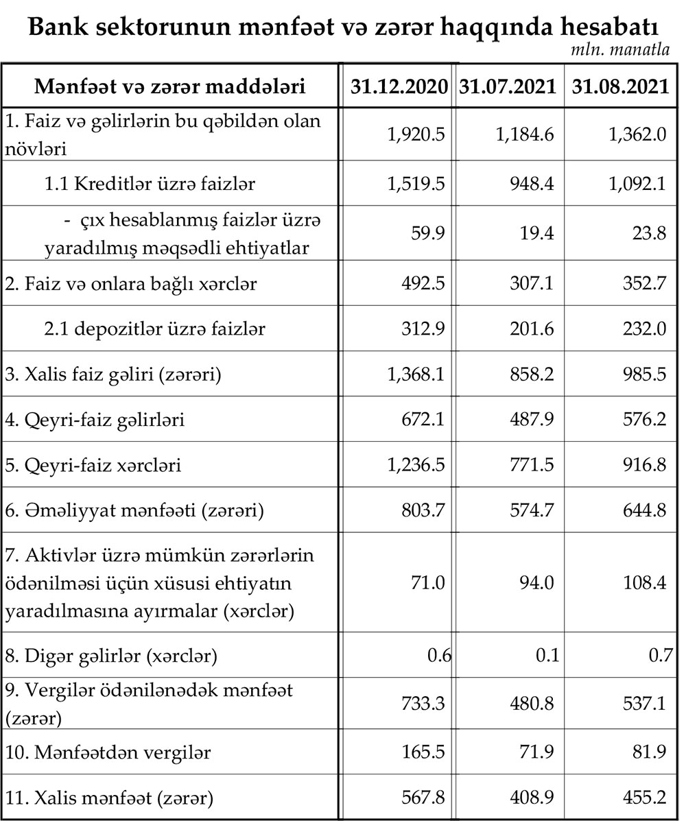 Azərbaycanın bank sektoru 2021-ci ilin 8 ayını 455,2 milyon manat xalis mənfəət ilə başa vurub. 2020-ci ilin 8 ayı ilə müqayisədə bank sektorunun xalis mənfəəti 17,5 milyon manat və ya 4% artıb.