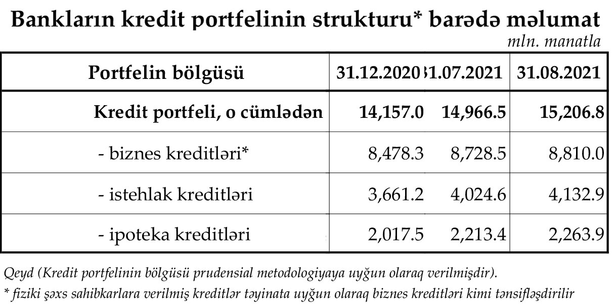 İyul ayı ilə müqayisədə Avqustda bankların kredit portfeli (müştərilərə verilən kreditlər) 240,3 milyon manat artaraq 15 milyard 206,8 milyon manata, xalis kreditlər (kreditlər üzrə mümkün zərərlərin ödənilməsi üçün məqsədli ehtiyat xaric kreditlər) 224,3 milyon manat artaraq 13 milyard 981.9 milyon manata çatıb.