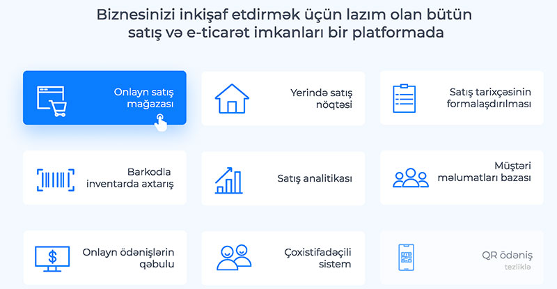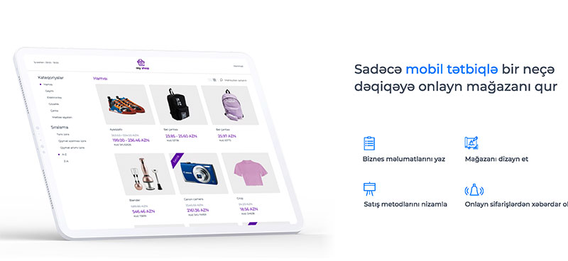 - Bizim gətirdiyimiz yeniliklərdən biri bir neçə toxunuşla internet mağaza aça bilməkdir. Biznes bizdə qeydiyyatdan keçdikdən sonra həm oflaynda xidmətlər alacaq, həm də avtomatik internet mağazaya sahib olacaq. Bir daha vurğulayım, bunun üçün heç bir xərc çəkilməyəcək.