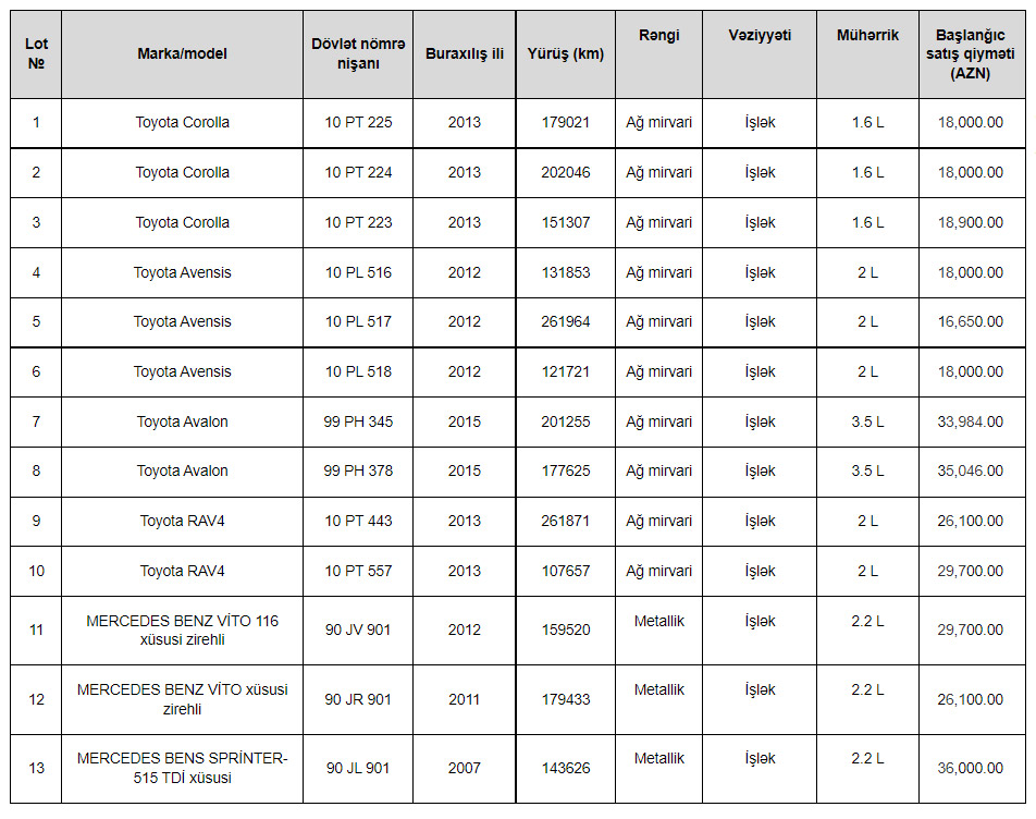 Hərraca çıxarılmış avtomobillərin siyahısı:
