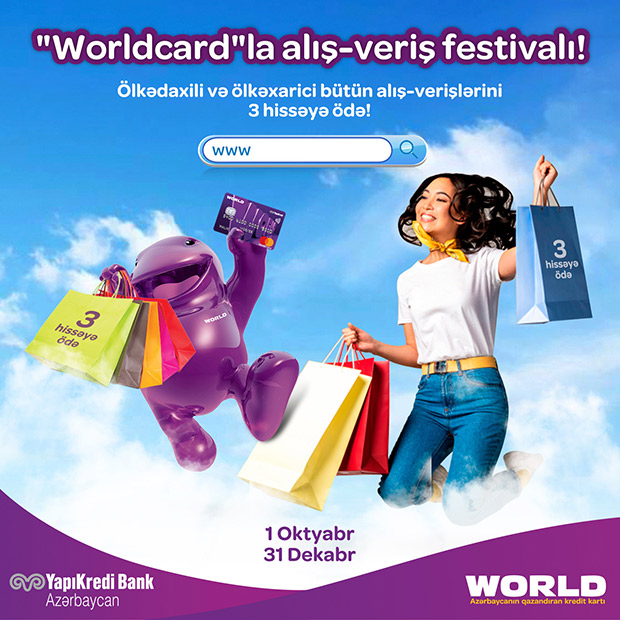 100 AZN və daha çox məbləğdə alış-verişlər 3 hissəyə bölünəcək!(®) “Yapı Kredi Bank Azərbaycan” Worldcard kredit kartının Azərbaycanda fəaliyyətə başlamasının 9-cu ili münasibəti ilə müştəriləri üçün yeni kampaniyasını təqdim edir.