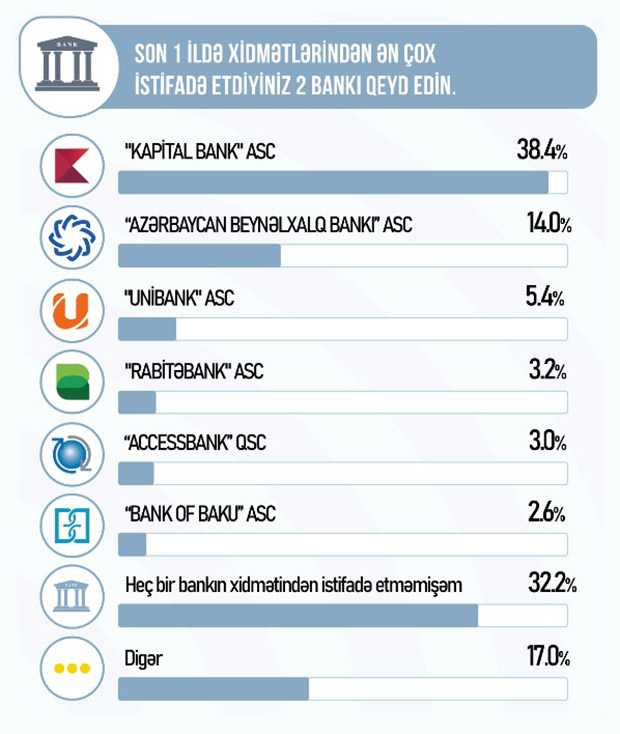 STM 24 avqust - 6 sentyabr 2021-ci il tarixlərində ölkə miqyasında əhali arasında telefon sorğusu keçirib. Kreditlər və ümumi bank xidmətləri ilə bağlı keçirilən sorğuda 1069 respondent iştirak edib. Respondentlər arasında son 1 ildə xidmətlərindən ən çox istifadə edilən banklar sırasında AccessBank top beşlikdə qərarlaşıb.