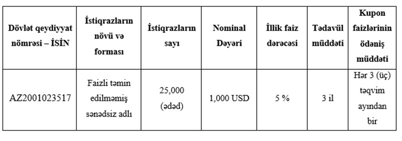 Faizli təmin edilməmiş sənədsiz adlı istiqrazların hər birinin nominal dəyəri 1000 ABŞ dolları, cəmi sayı 25 min ədəd, təklif olunan illik faiz dərəcəsi (gəlirlilik) 5%, tədavül müddəti 3 ildir. Kupon faizlərinin ödəniş müddəti hər 3 təqvim ayından bir olacaqdır.