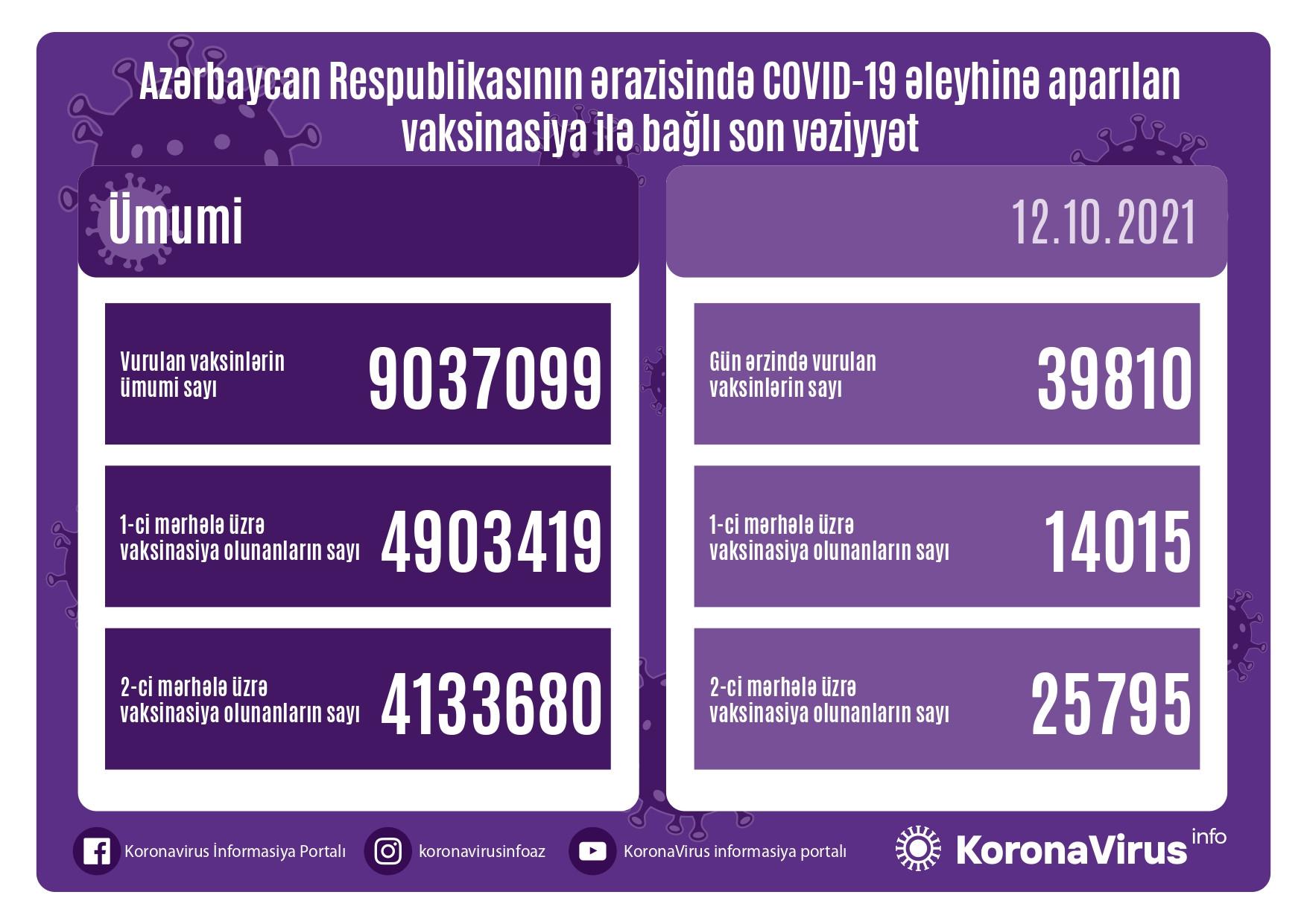 Ölkədə vurulan vaksinlərin ümumi sayı 9 037 099, birinci mərhələ üzrə vaksinasiya olunanların ümumi sayı 4 903 419, ikinci mərhələ üzrə vaksinasiya olunanların sayı isə 4 133 680 təşkil edir.