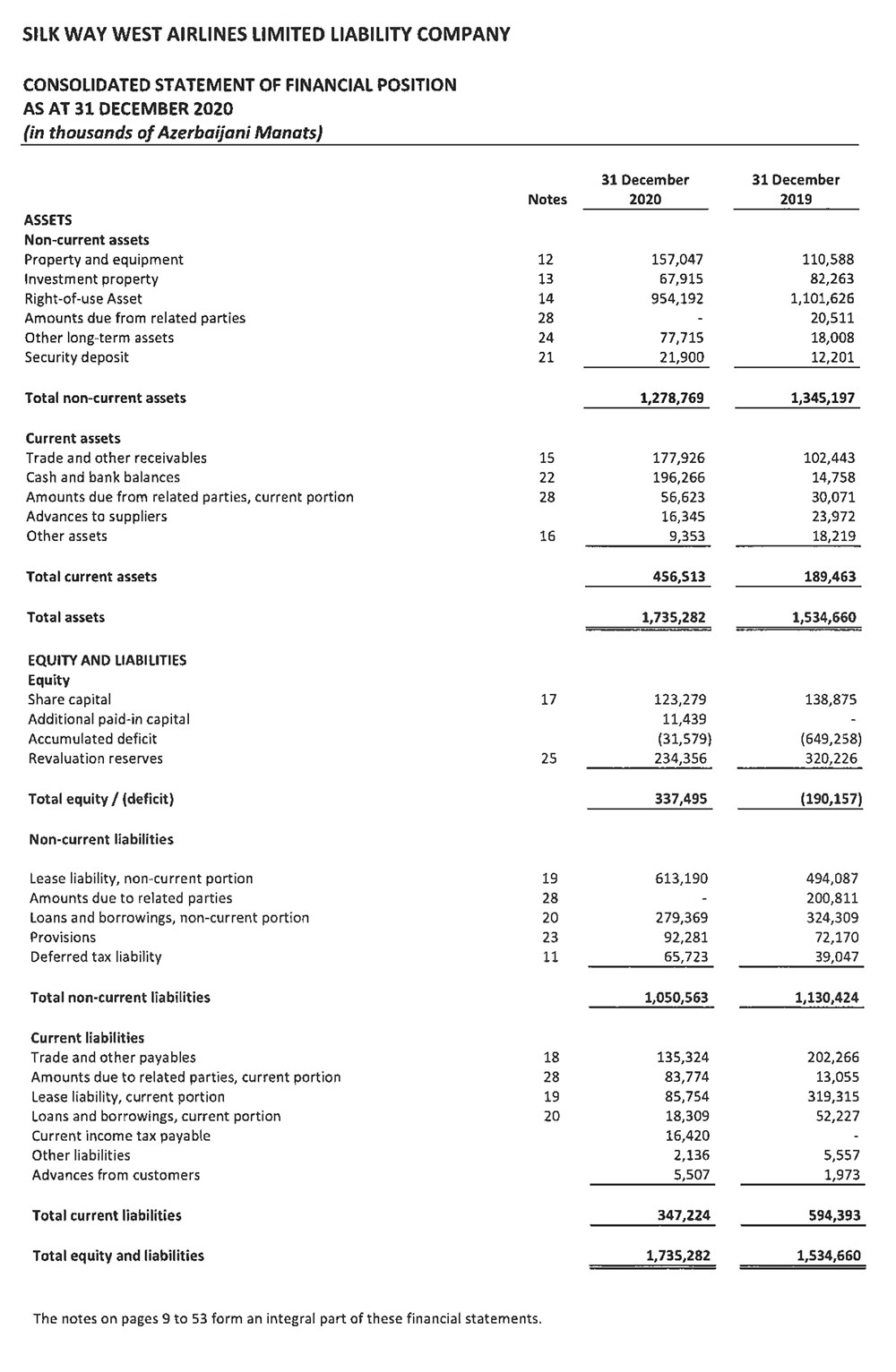 31 Dekabr 2021-ci il tarixində “Silk Vey Vest Aviaşirkəti” MMC 1 milyard 735 milyon 282 min manat cəmi aktivlərə, 337 milyon 495 min manat cəmi kapitala malik olub.