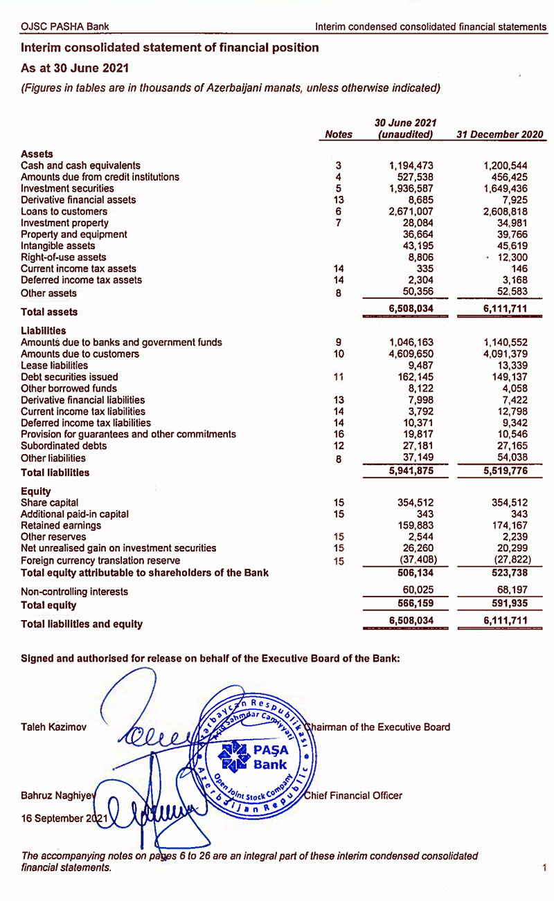 2020-ci ilin 1-ci yarısı ilə müqayisədə 2021-ci ilin 1-ci yarısında PAŞA Bankın cəm aktivləri 7% artaraq 5 milyard 920 milyon 485 min manata, müştərilərə verilən kreditlər 4% artaraq 2 milyard 259 milyon 340 min manata, müştərilərdən cəlb olunan vəsaitlər isə 14% artaraq 4 milyard 506 milyon 393 min manata çatıb.