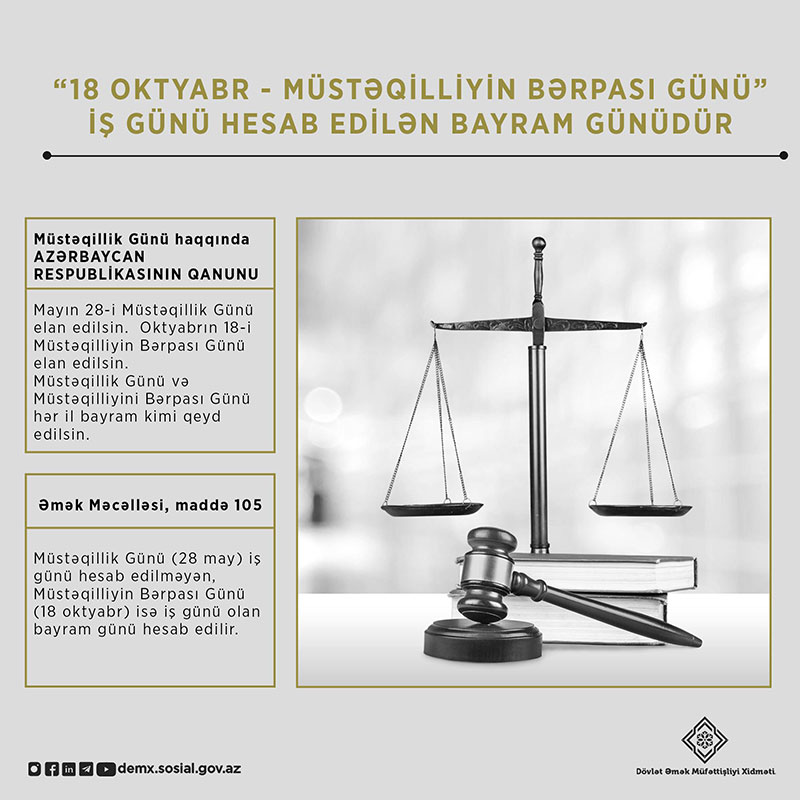 "Müstəqillik Günü (28 may) qeyri-iş günü, Müstəqilliyin Bərpası Günü (18 oktyabr) isə iş günü olan bayram sayılacaq".