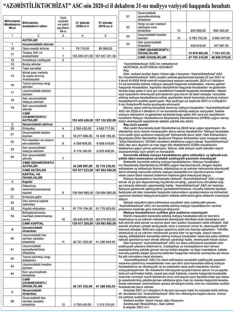 Bakı şəhərində və respublikanın regionlarında yaşayış evlərinin, binaların, təhsil, səhiyyə müəssisələrinin və digər sosial təyinatlı obyektlərin istilik təchizatını təmin edən “Azəristiliktəchizat” ASC 2020-ci il dekabrın 31-nə balans haqqında hesabatını açıqlayıb.