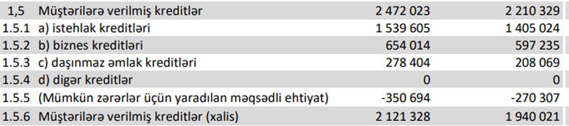 Mümkün zərərlər üçün yaradılan məqsədli ehtiyat xaric kredit portfeli (xalis kreditlər) 181 miylon 307 min manat artaraq 2 milyard 121 milyon 328 min manata yüksəlib. Ötən ilin Sentaybr ayının sonunda bu rəqəm 1 milyard 940 milyon 21 min manat idi.