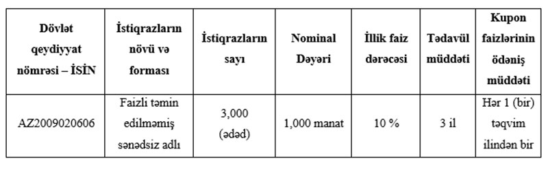 İstiqrazlar üzrə illik faiz dərəcəsi 10%, tədavül müddəti 3 ildir. Kupon faizlərinin ödəniş müddəti hər təqvim ilindən birdir.