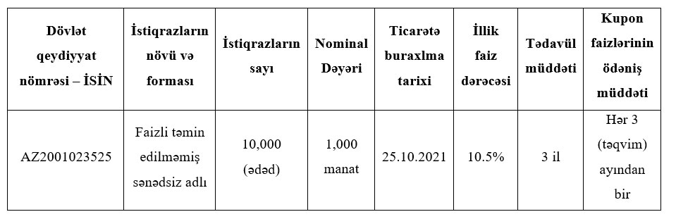 Birjanın yaydığı məlumata görə, qeyd olunan istiqrazların yerləşdirilməsi Bakı Fond Birjasında birqiymətli hərrac üsulu ilə həyata keçiriləcəkdir.