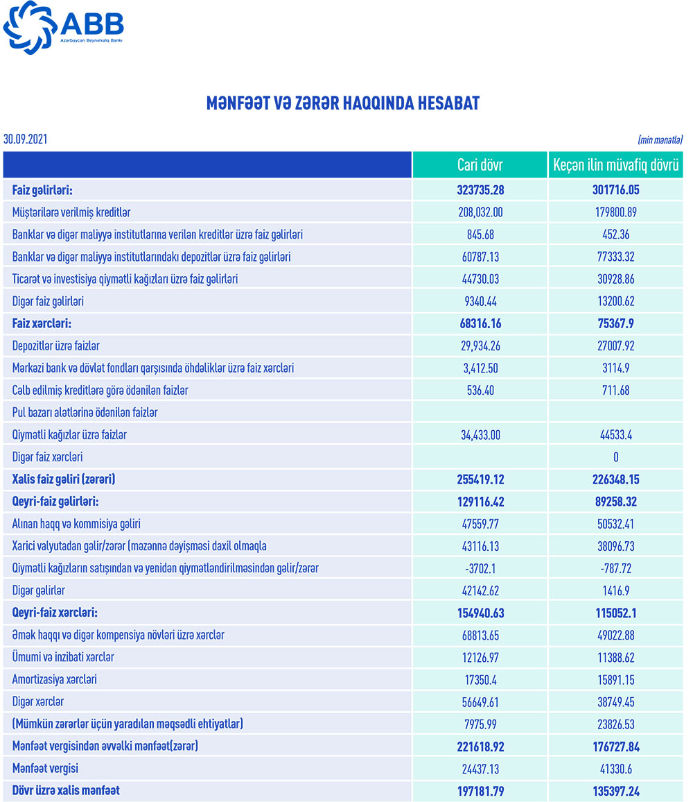 Xatırladaq ki, 2020-ci ilin 9 ayı ərzində ABB-nin cəmi əməliyyat gəlirləri 390 milyon 974 min manat, cəmi əməliyyat xərcləri 190 milyon 420 min manat, əməliyyat mənfəəti 200 milyon 554 min manat təşkil etmişdi. Bank əməliyyat mənfətindən mümkün zərərlər üçün yaradılan ehtiyata 23 milyon 826 min manat ayırmış, 41 milyon 331 min manat mənfəət vergisi ödəmiş və həmin dövrü 135 milyon 397 min manat xalis mənfəətlə bağlamışdı.