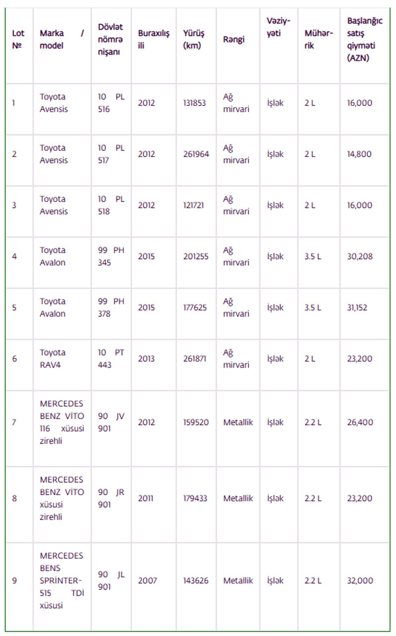 Bank işlənmiş avtomobillərini satır - SİYAHI, QİYMƏTLƏR