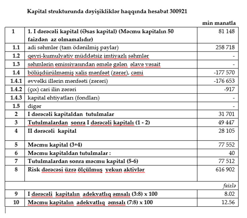 30 Sentyabr 2021-ci il tarixində "AccessBank" 77 milyon 512 min manat məcmu kapitala malik olub, bu da minimum məcmu kapital tələbindən (50 milyon manat) 27 milyon 512 min manat artıqdır.