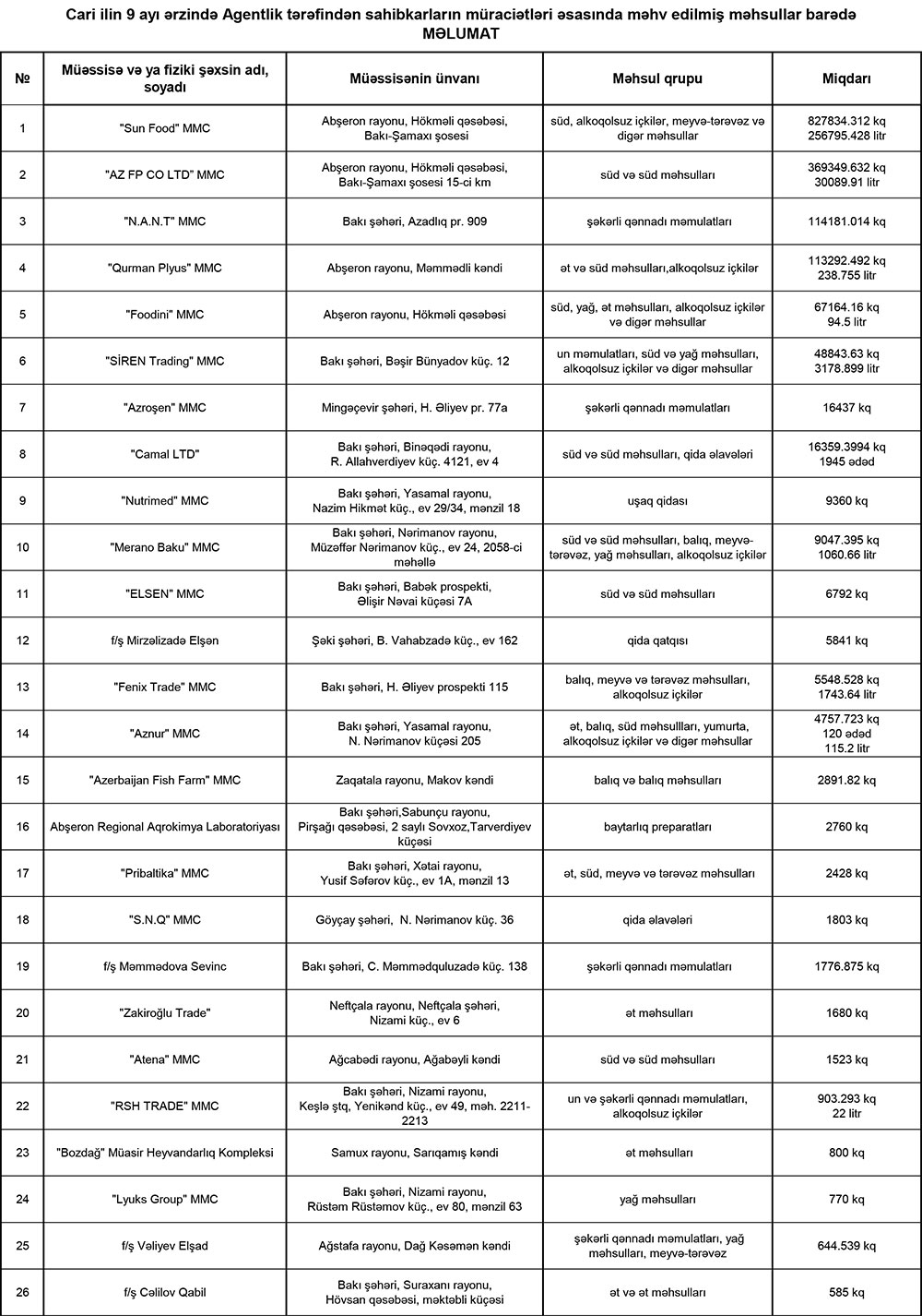 Qida Təhlükəsizliyi Agentliyi 2021-ci ilin 9 ayı ərzində istifadə müddəti bitmiş, istehlaka yararsız qida məhsullarının geri çağırılması və məhv edilməsi təşəbbüsü ilə çıxış edən şirkət və sahibkarlaın siyahısını açıqlayıb.