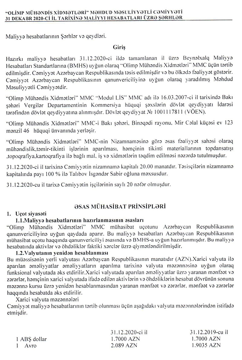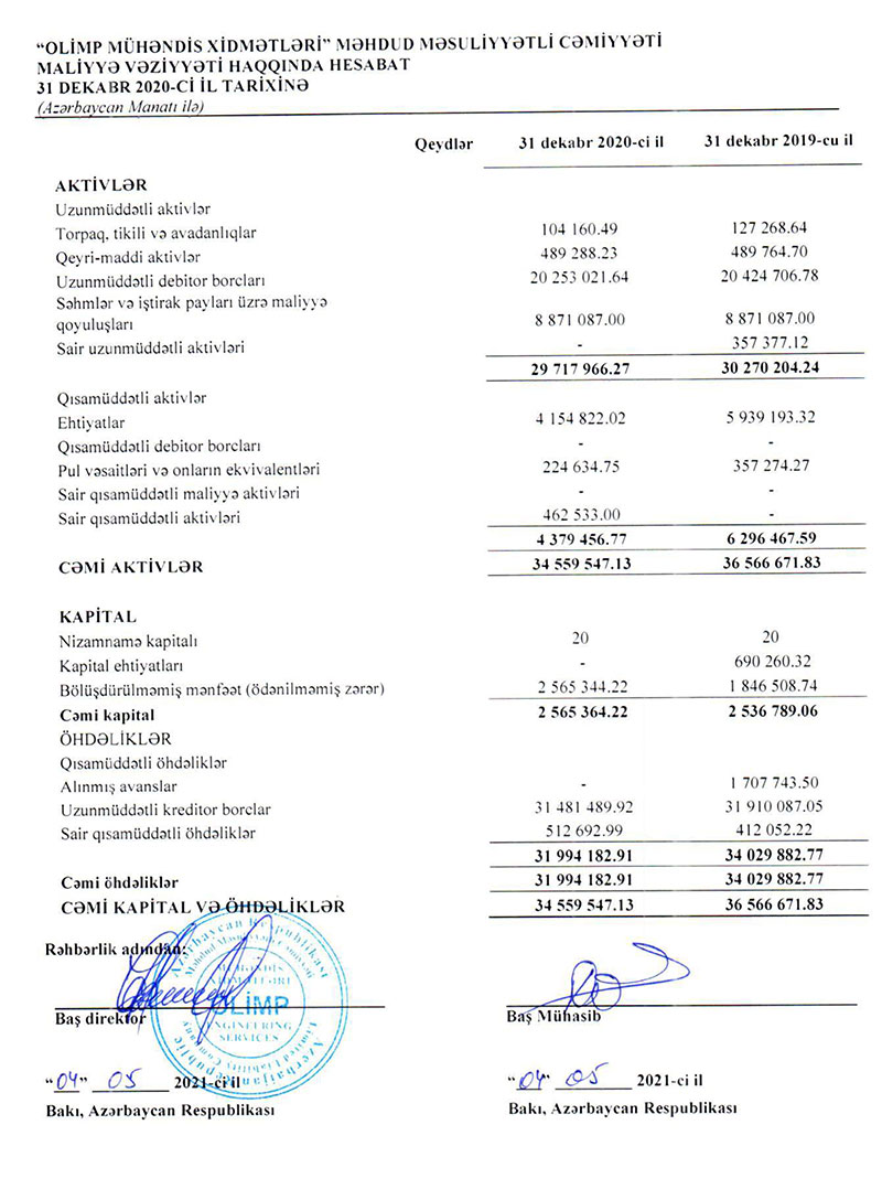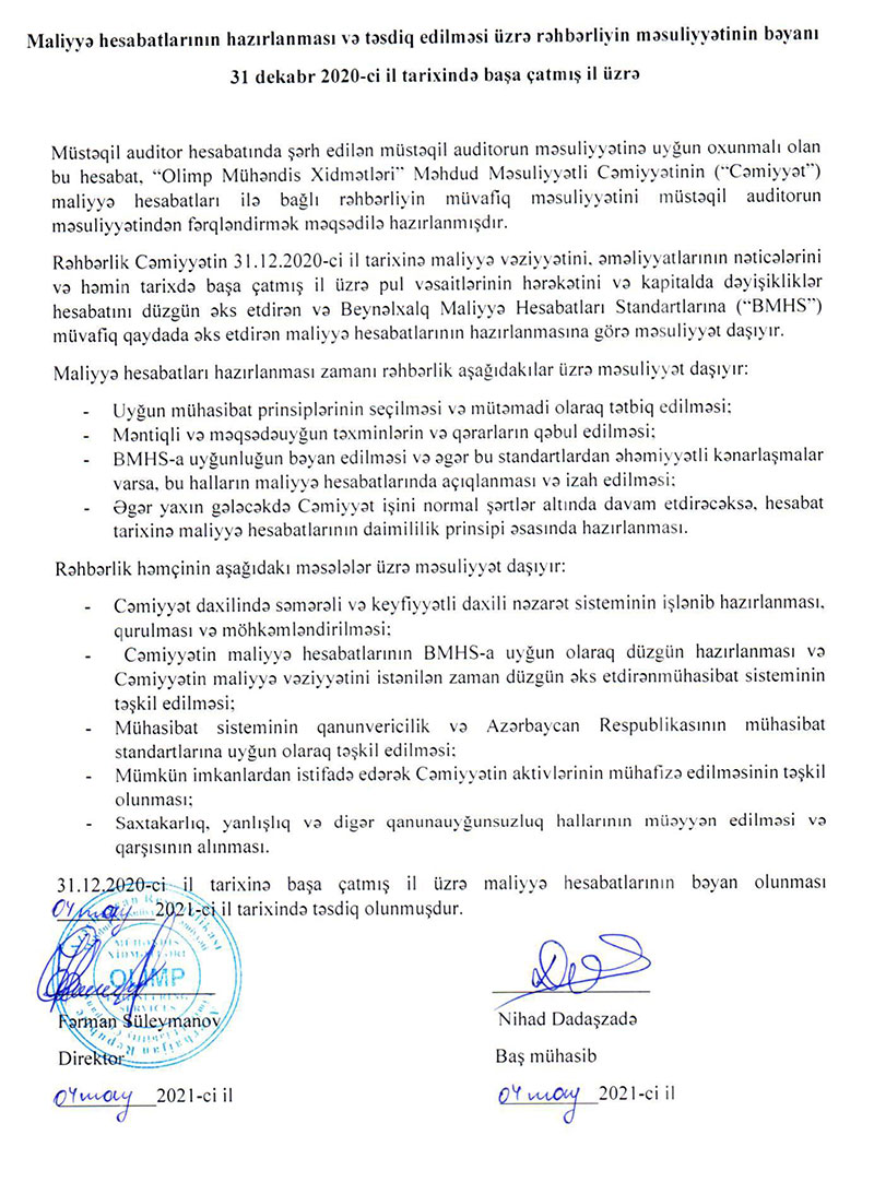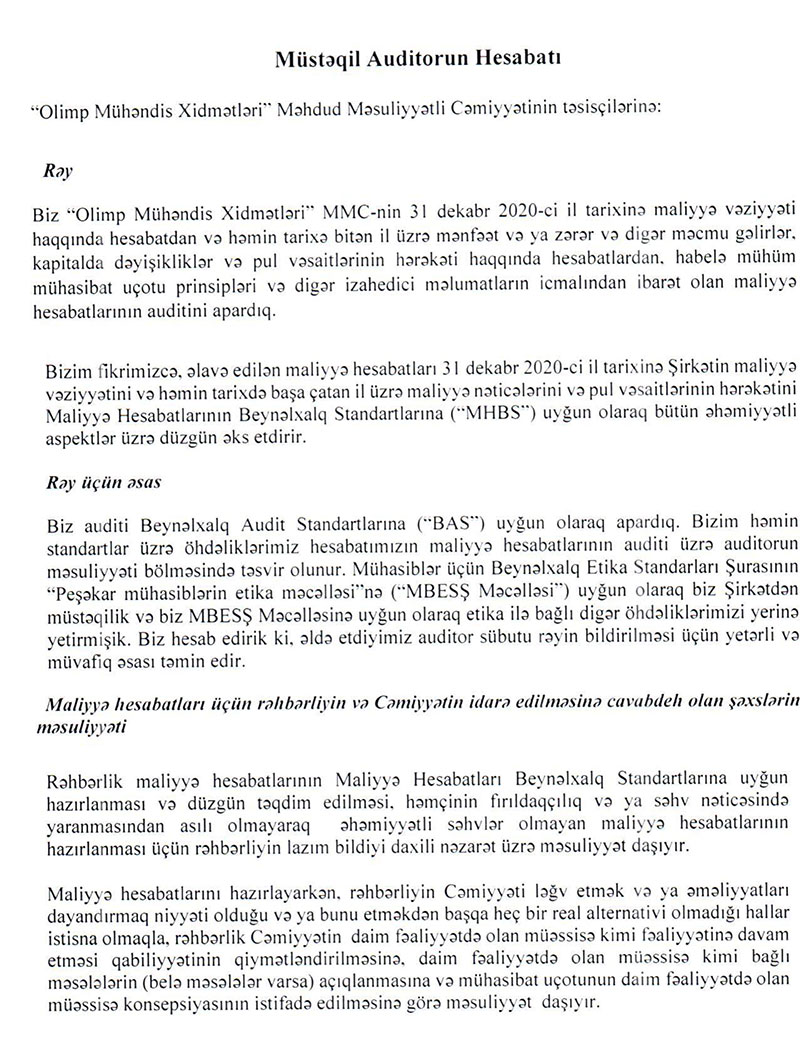 "Olimp Mühəndis Xidmətləri" MMC-nin 31 dekabr 2020-ci il tarixinə maliyyə hesabatları və müstəqil auditor rəyi.