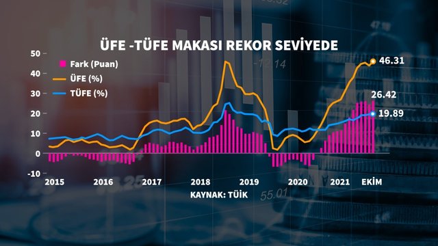 Oktyabrda istehsalçı inflyasiyası isə illik 46,31% artıb. Beləliklə illik istehsalçı inflyasiyasında 2002-ci ilin İyun ayından bu yana ən yüksək səviyyə qeydə alınıb. Rəqəmlər istehlakçı və istehsalçı inflyasiyası arasındakı "qayçının" da rekord səviyyəyə yüksəldiyini göstərir.