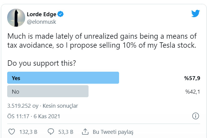 Tesla şirkətinin qurucusu İlon Mask, Twitter istifadəçilərindən, Tesla səhmlərinin 10%-ni satıb-satmamasına qərar vermələrini istəyib. Nəticədə 3,5 milyondan çox sorğu iştirakçısının 57,9%-i qiymətli kağızların mümkün satışını dəstəkləyib. Bundan sonra sahibkar təsdiqləyib: “Mən istənilən nəticəni qəbul etməyə hazır idim”.Sahibkar İlon Mask Twitter səhifəsində, qurduğu Tesla şirkətinin səhmlərinin 10%-ni satıb-satmaması barədə sorğu keçirib.