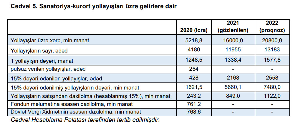 “Sığortaolunanların sanatoriya-kurort müalicəsi və sağlamlaşdırma tədbirlərinin həyata keçirilməsi üzrə xərclərdə proqnozlaşdırılmış artımı Dövlət Sosial Müdafiə Fondunun (DSMF) cəmi xərclərinin artım tempindən daha sürətlə nəzərdə tutulmuşdur”.