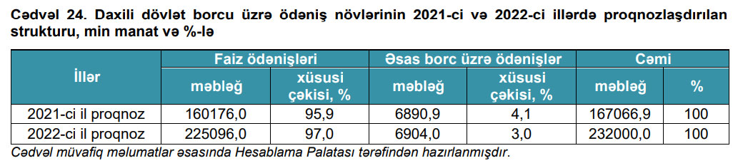 Faiz xərclərinin isə cari ilə nisbətən 64,9 milyon manat və ya 40,5% artması əvvəlki illərdə buraxılmış və cari ilin sonuna kimi emissiya ediləcək dövlət istiqrazları üzrə faiz və diskont xərclərinin və növbəti ilə nəzərdə tutulan iri həcmli emissiyanın faiz xərclərinin ödənilməsilə əlaqələndirilmişdir. Qeyd edək ki, yaranma mənbəyi üzrə daxili dövlət borcu üçün ödənişlər dövlət istiqrazlarının yerləşdirilməsi və Mərkəzi Bankdan alınmış kreditlər üzrə xərclərdən ibarətdir. 2022-ci il dövlət büdcəsinin layihəsində daxili dövlət borcu üzrə əsas borc təqribən eyni nəzərdə tutulsa da, faiz ödənişləri əhəmiyyətli artımla proqnozlaşdırılmışdır”.