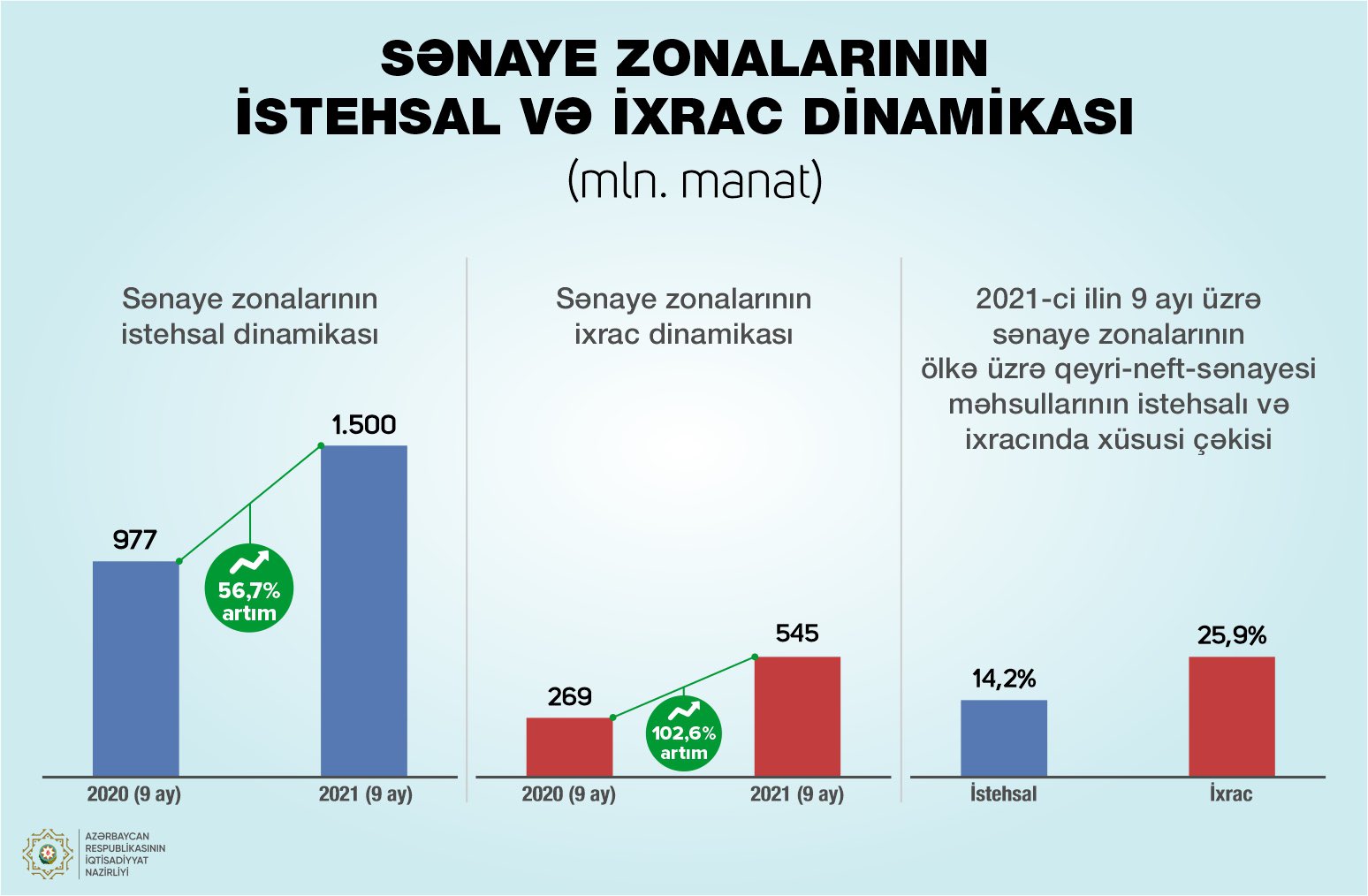 Nazir qeyd edib ki, bunun 1,4 milyard manatlıq hissəsi və ya təxminən 28%-i ixrac olunub. 2021-ci ilin 9 ayında isə, sənaye zonalarında məhsul istehsalı ötən ilin müvafiq dövrü ilə müqayisədə 55,4% artaraq 1,5 milyard manatdan çox, ixrac isə 2 dəfə artımla 545 milyon manat təşkil edib. Bu dövrdə sənaye zonalarının qeyri-neft sənayesi məhsulları istehsalında xüsusi çəkisi 14,3%, ixracında 25,9% olub.