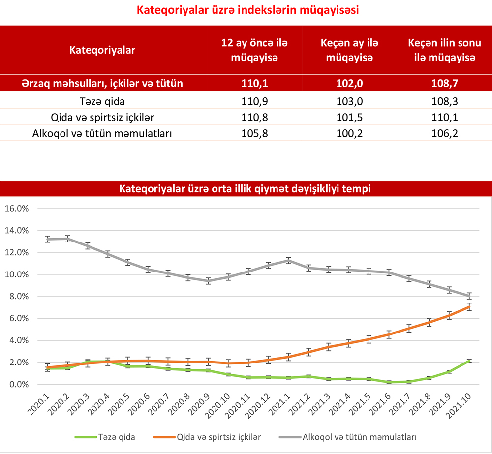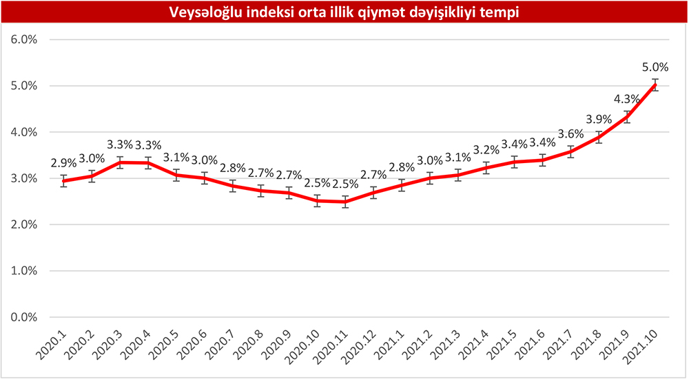2021-ci ilin oktyabr ayında “Veysəloğlu Pərakəndə İndeksi”nə daxil edilən məhsulların qiymətində 2020-ci ilin oktyabr ayına nisbətən 10,1% artım olub. Qeyd edək ki, 2021-ci ilin oktyabr ayında təzə qida məhsullarının (qısamüddətli istifadəyə yararlı istehlak məhsulları) qiymətində 2020-ci ilin oktyabr ayına nisbətən 10,9%, qida və spirtsiz içkilərdə 10,8%, alkoqol və tütün məmulatlarında isə 5,8% artım müşahidə edilib.