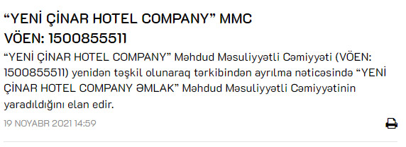 Marja xəbər veri ki, bunun səbəb tərkibindən ayrılma nəticəsində “YENİ ÇİNAR HOTEL COMPANY ƏMLAK” MMC-nin yaradılmasıdır.