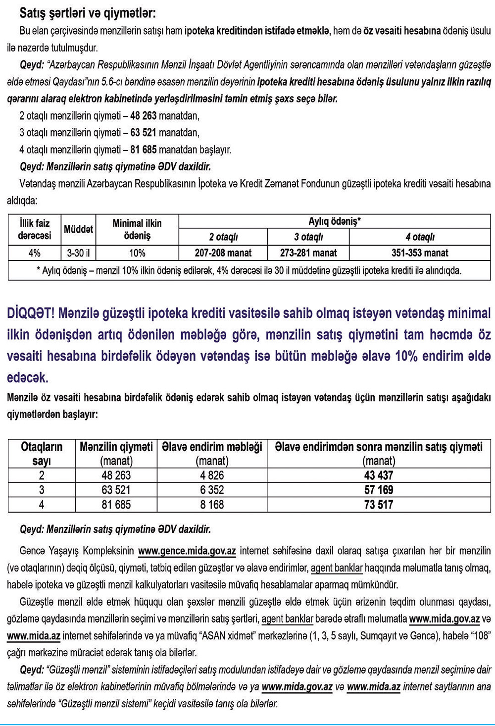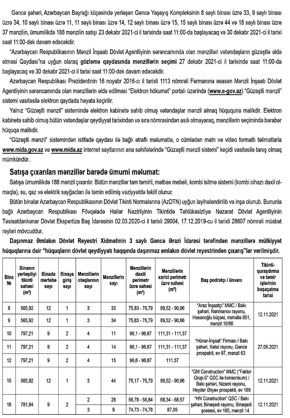 Azərbaycan Respublikasının Mənzil İnşaat Dövlət Agentliyi (MİDA) növbəti layihəsi - Gəncə yaşayış kompleksindəki mənzillərin güzəştlə satışını elan edib.