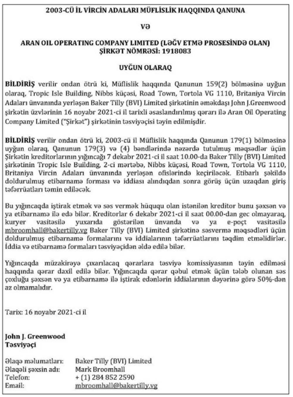Marja xəbər verir ki, "Baker Tilly" şirkətinin nümayəndəsi şirkətin təsviyəçisi (ləğvedici) təyin edilib.