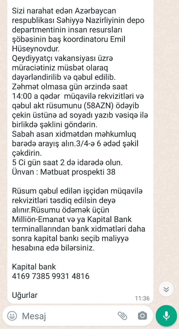 Məlumatda qeyd edilib ki, mesaj göndərən şəxs Səhiyyə Nazirliyi depo departamentinin insan resursları şöbəsinin baş koordinatoru Emil Hüseynov olduğunu iddia edir: “Həmin şəxs vətəndaşların müxtəlif vakansiyalar üzrə müraciətlərinin müsbət dəyərləndirildiyini iddia edir və bunun təsdiqi üçün onlardan 58 manat ödəniş etməsini tələb edir.