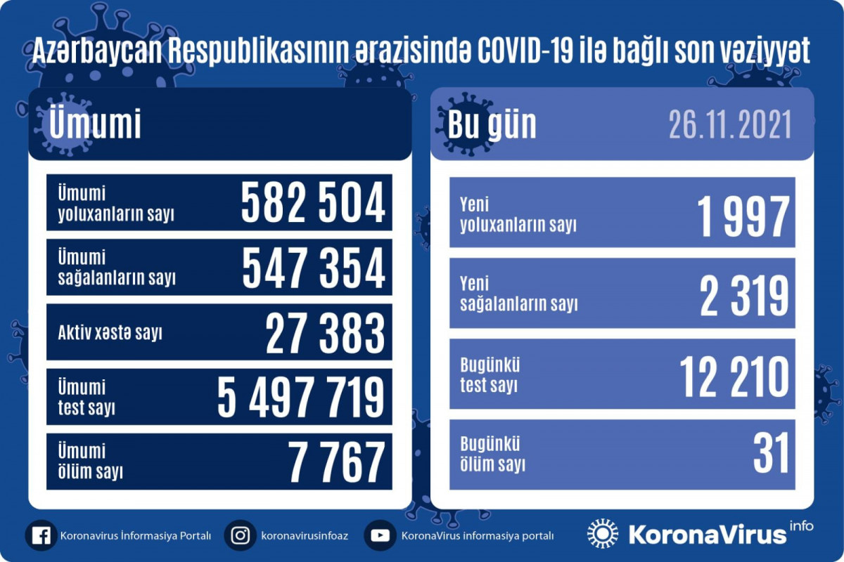 Azərbaycan Respublikasında koronavirus (COVID-19) infeksiyasına 1997 yeni yoluxma faktı qeydə alınıb, 2319 nəfər müalicə olunaraq sağalıb.