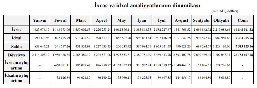 Xatırladaq ki, 2020-ci ilin yanvar-oktyabr dövründə (10 ayında) Azərbaycanın xarici ticarət əməliyyatlarının həcmi 21 milyard 1 milyon 380 min ABŞ dolları, o cümlədən ixrac 12 milyard 234 milyon 23.4 min ABŞ dolları, idxal 8 milyard 767 milyon 356 min ABŞ dolları, müsbət saldo 3 milyard 466 milyon 667 min ABŞ dolları təşkil etmişdi.