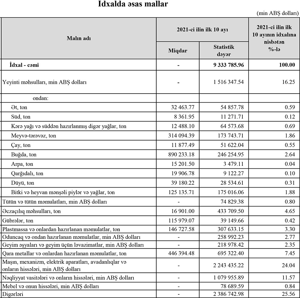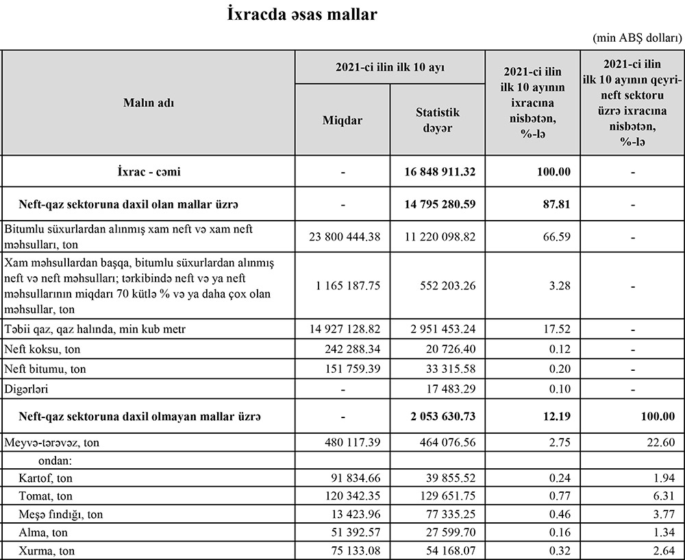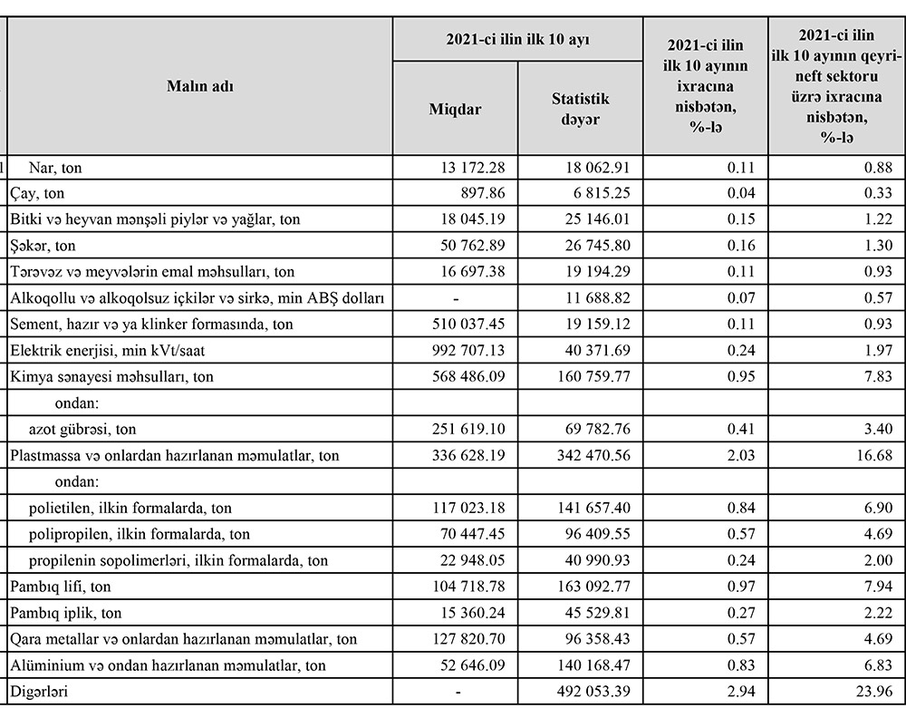 2021-ci ilin yanvar-oktyabr aylarında (10 ayda) Azərbaycanın ən çox ixrac və idxal etdiyi mallar açıqlanıb.