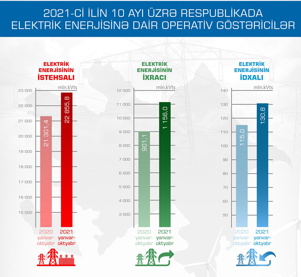 2021-ci ilin 10 ayı ərzində elektrik enerjisinin ixracı 1156,0 mln. kVt·st olmaqla, 2020-ci ilin müvafiq dövrü ilə müqayisədə 254,9 mln. kVt·st artıb. İrana 252,8 mln. kVt·st, Türkiyəyə 318,6 mln. kVt·st, Rusiyaya 79,1 mln. kVt·st, Gürcüstana isə 505,5 mln. kVt·st elektrik enerjisi ixrac edilib.
