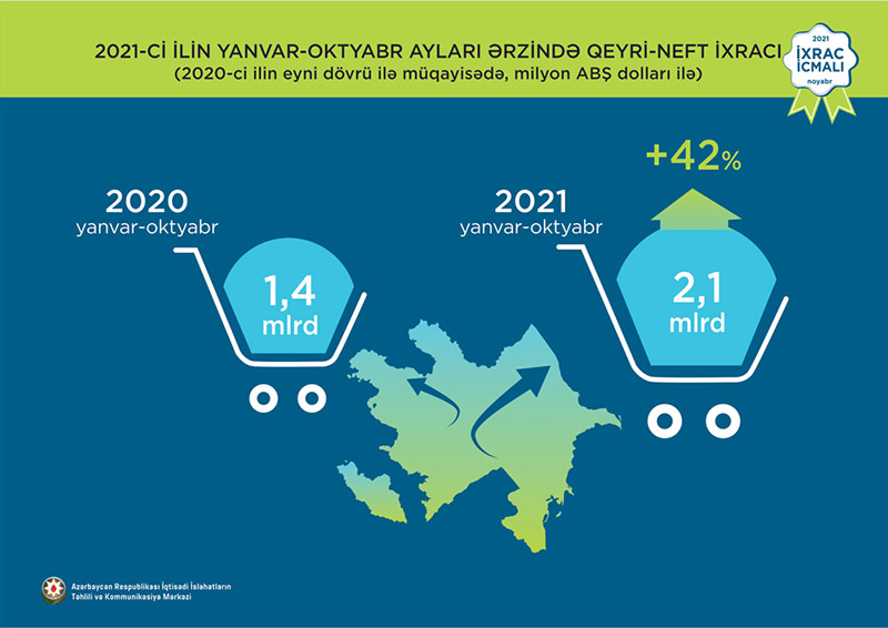 Normallaşma prosesinin davam etdiyi dövrdə oktyabr ayı üzrə ixrac 2,2 mlrd ABŞ dolları təşkil edib. Qeyri-neft sektoru üzrə ixracda artım 50,4% təşkil etməklə 244,6 mln ABŞ dolları olub. 2021-ci ilin oktyabr ayı ərzində yeyinti məhsulları üzrə ixrac 76,5 milyon ABŞ dolları təşkil edib. Qeyri-yeyinti məhsulları üzrə isə 2 dəfə artaraq 168 milyon ABŞ dolları təşkil edib.