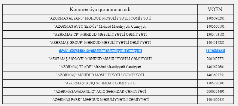 03 Dekabr 2021-ci il tarixində İqtisadiyyat Nazirliyi yanında Dövlət Vergi Xidmətinin Bakı şəhəri Lokal Gəlirlər Baş İdarəsi "Azərmaş Lizinq" Məhdud Məsuliyyətli Cəmiyyətini dövlət qeydiyyatına alıb.