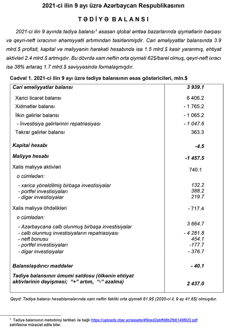 Azərbaycanın tədiyə balansının saldosu 1 milyard 803.7 milyon dollar kəsirdən, 2 milyard 437 milyon dollar profisitə keçib.2021-ci ilin 9 ayında Azərbaycanın tədiyə balansının ümumi saldosu müsbət 2 milyard 437 milyon dollar təşkil edib. Müqayisə üçün qeyd edək ki, 2020-ci ilin 9 ayında tədiyə balansının ümumi saldosu mənfi 1 milyard 803.7 milyon dollar təşkil etmişdi.