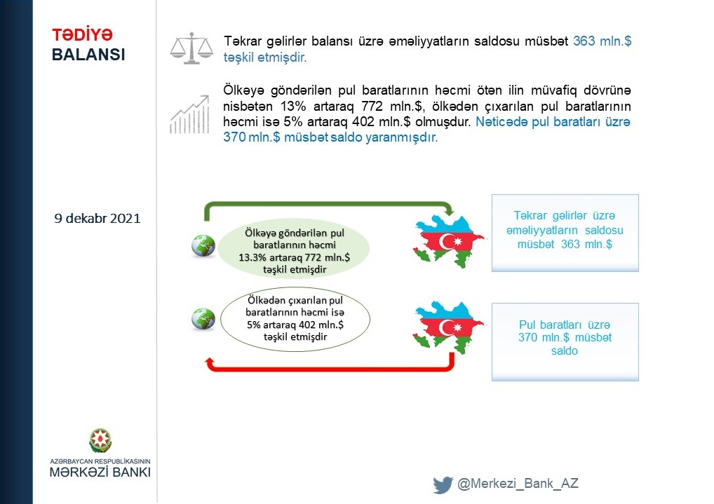 Marja.az Mərkəzi Banka istinadən xəbər verir ki, 2021-ci ilin 9 ayında tədiyə balansı əsasən qlobal əmtəə bazarlarında qiymətlərin bərpası və qeyri-neft ixracının əhəmiyyətli artımından təsirlənmişdir.