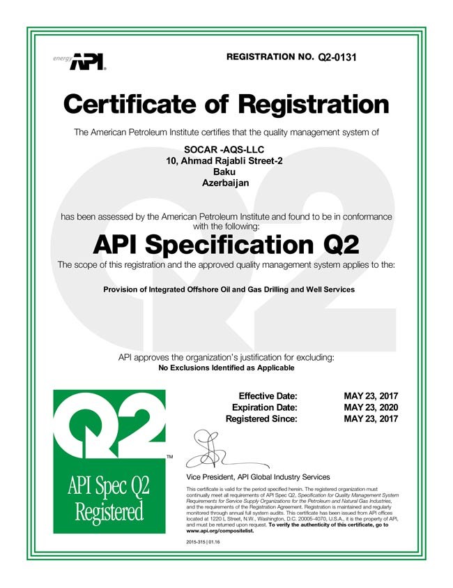23 may 2017-ci il tarixində SOCAR-AQŞ Azərbaycanda fəaliyyət göstərən qazma müəssisələri arasında ilk olaraq API komitəsi tərəfindən API Spec Q2 sertifikatına layiq görülmüşdür. Bu barədə “Marja”ya SOCAR-AQŞ şirkətindən bildirilib.