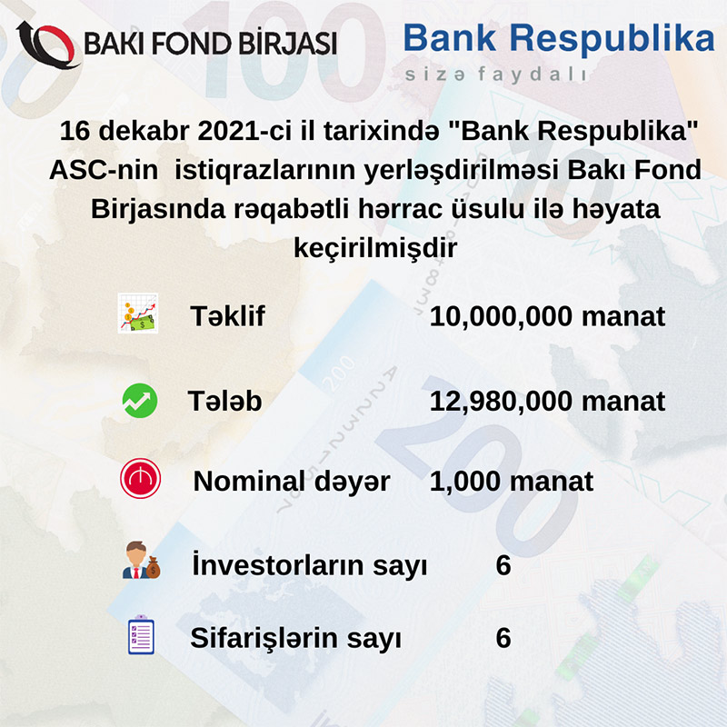 16 dekabr 2021-ci il tarixində Bakı Fond Birjasında "Bank Respublika" ASC-nin tədavül müddəti 2 (iki) təqvim ili olan AZ2003002881 dövlət qeydiyyat nömrəli, 10 milyon manat həcmində, faizli, təmin edilməmiş sənədsiz, adlı istiqrazlarının yerləşdirilməsi üzrə hərrac yekunlaşıb.